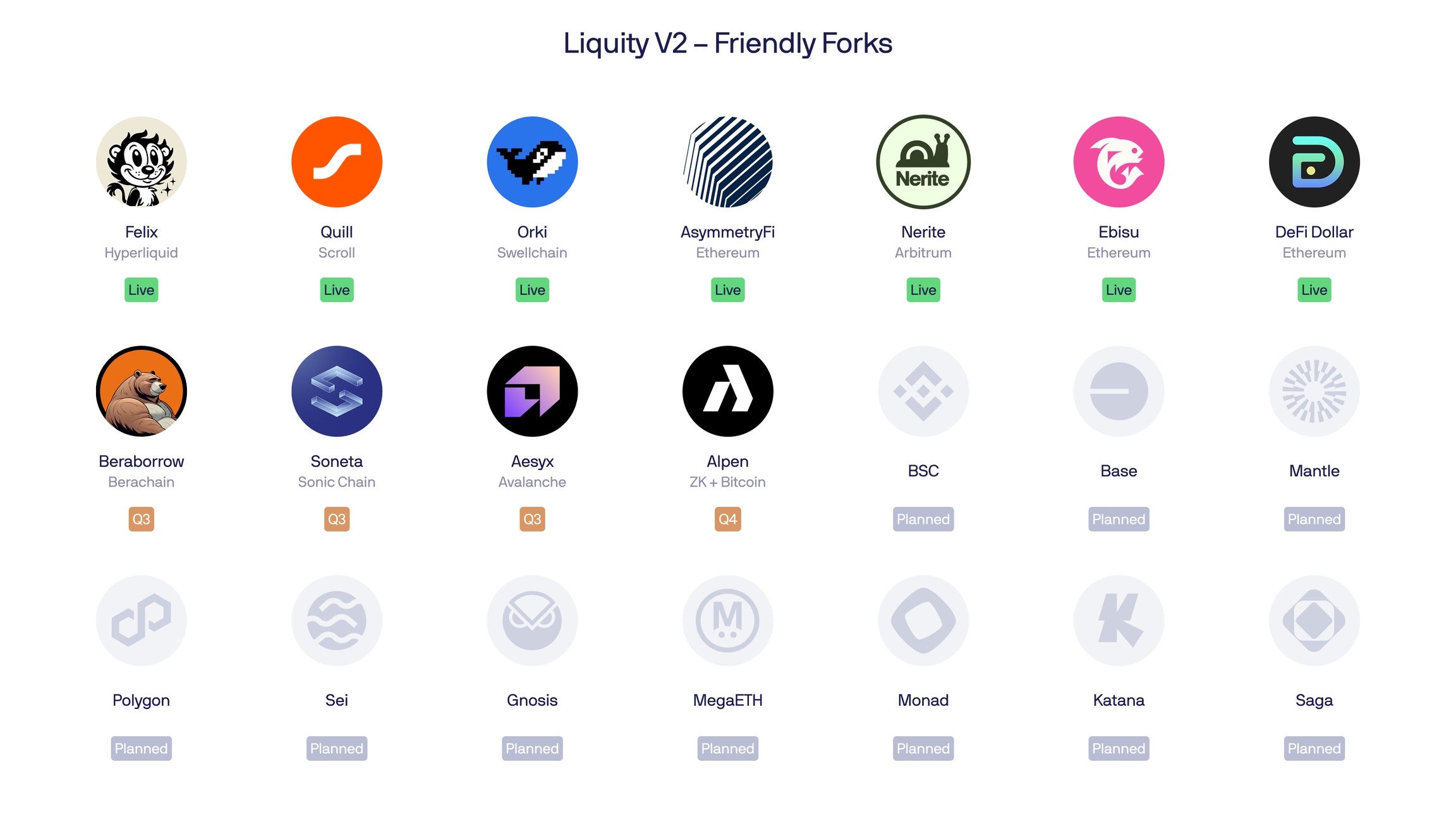 따라서, BOLD 민팅이 지원되지 않는 블록체인 네트워크 및 담보 자산 유형을 제공하는 많은 Friendly Fork들이 Liquity AG와 라이센스 계약을 체결했습니다. Liquity V2 코드를 사용하여 자체 스테이블 코인을 배포하는 대가로, 이러한 프로젝트들은 자사 사용자와 BOLD 사용자 간의 협업을 촉진하는 인센티브를 제공하기로 약속했습니다.
