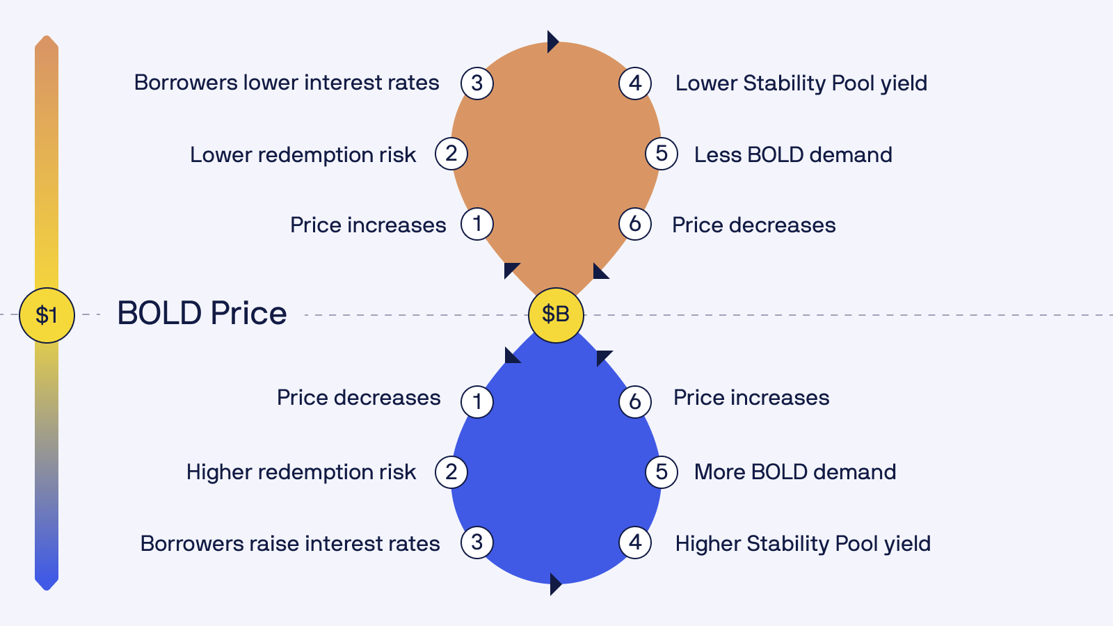 Liquity V2์ ์์ฅ ์ค์ฌ ํตํ ์ ์ฑ ์ ์ฌ์ฉ์ ์ค์ ์ด์์จ์ ํตํด ์์จ์ ์ผ๋ก ์ด๋ฃจ์ด์ง๋ฉฐ ์ด๋ฅผ ํตํด BOLD์ ๊ฐ๊ฒฉ์ด $1 ์ด์ ๋๋ ์ดํ์ธ ์ํฉ์ ๋์ ์ธ ๋์์ด ๊ฐ๋ฅํฉ๋๋ค.