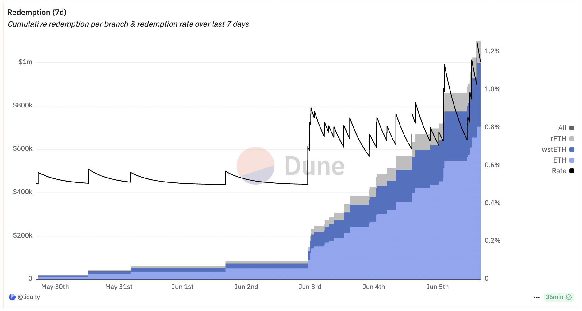 그러나 이 숫자는 단순한 참고치이며, 최근 리뎀션 내역들도 함께 고려해야 합니다. 예를 들어 지난 주에 200K BOLD에 대해서만 리뎀션이 진행되었다면, 15M BOLD가 리뎀션된 경우보다 위험이 적습니다. 이러한 리뎀션 내역은 Dune dashboard에서 확인할 수 있습니다.