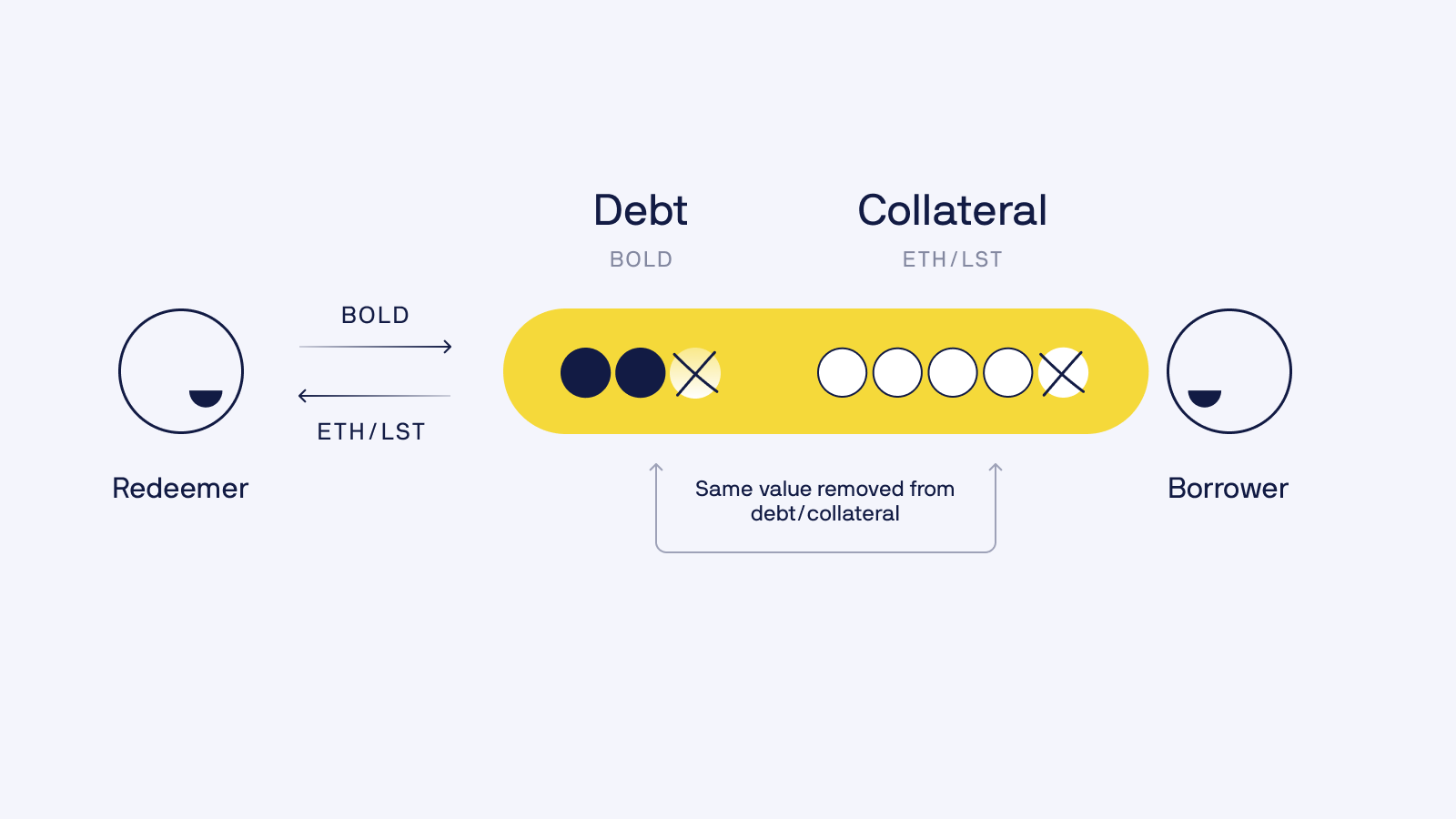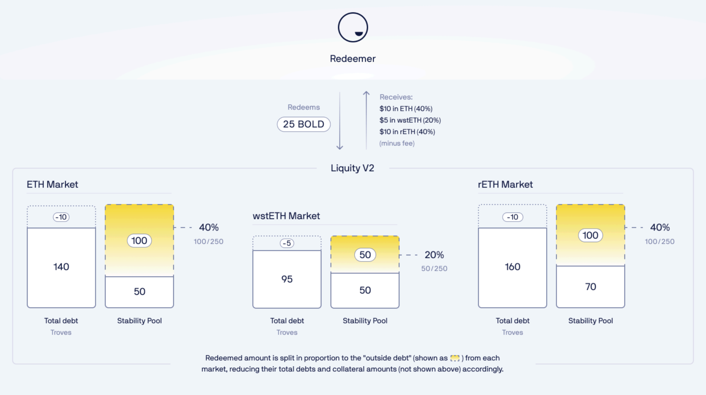 리뎀션의 참여자(이하 Redeemer)는 프로토콜에 BOLD를 전송하고 그 대가로 리뎀션 수수료를 제한 가치의 WETH, wstETH, rETH의 혼합을 받습니다. 리뎀션이 진행된 금액은 스테빌리티 풀의 담보자산에 따라 분할됩니다. (세부 사항 : https://docs.liquity.org/v2-faq/redemptions-and-delegation#docs-internal-guid-6cda6d73-7fff-78b8-1c4f-6cb96385a98a )