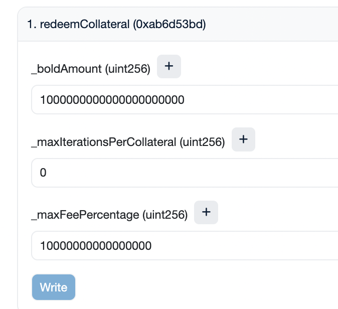 이제 CollateralRegistry 계약을 통해 BOLD 리뎀션을 진행 할 수 있습니다: