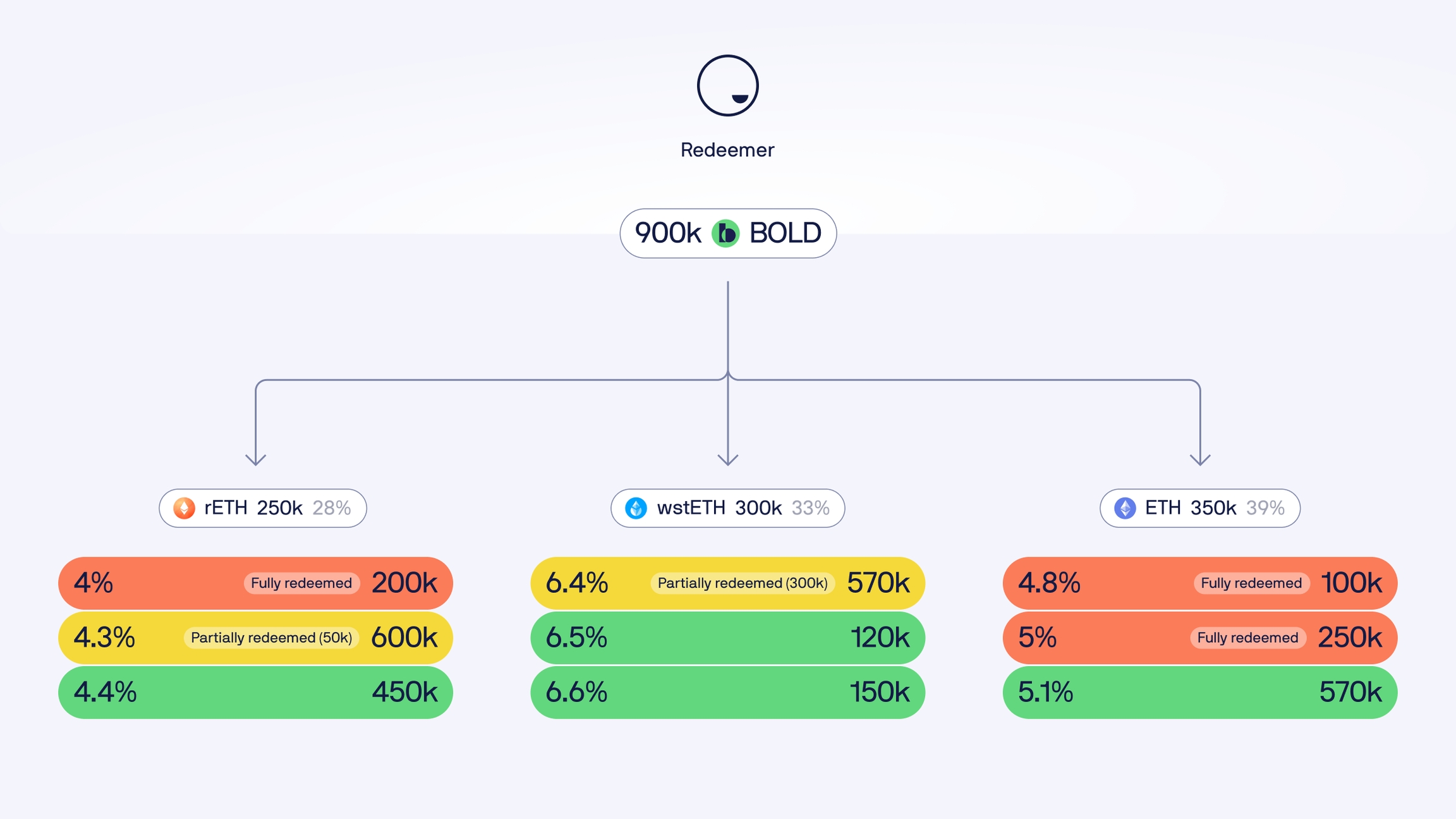 Вот пример: при внешнем долге в размере 100 BOLD, 50 BOLD и 100 BOLD соответственно, погашение приведет к разделению 40% (WETH), 20% (wstETH) и 40% (rETH).